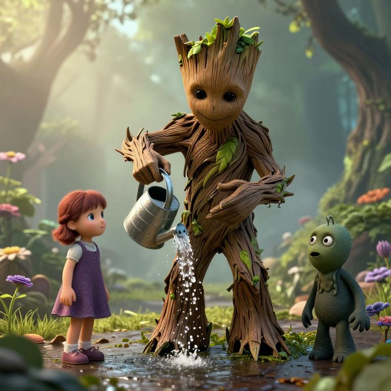 Photorealistic wide shot of groot watering audrey two from little shop or horrors with a watering can, octane render, unreal engine 4k, volumetric light, fog, detailed �n 9