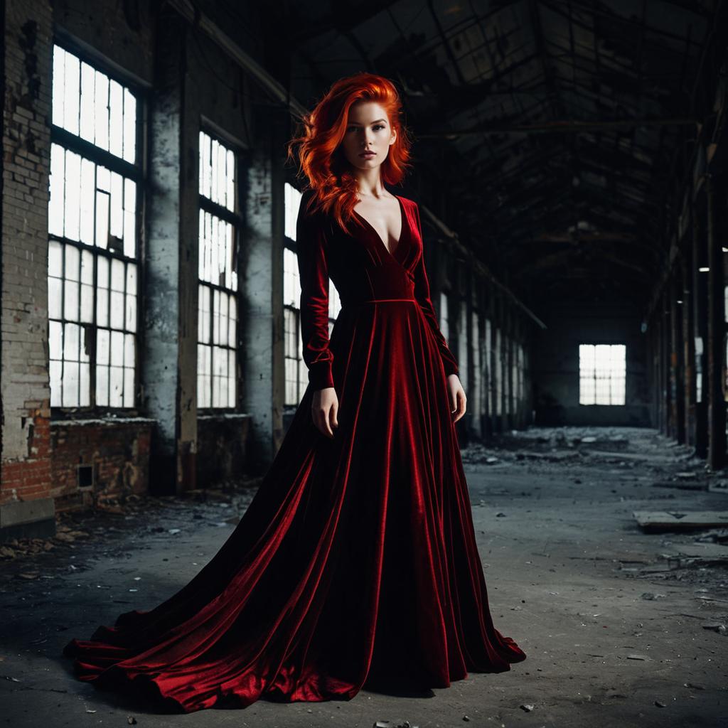 Fiery Red hairstyle on elegant woman, wearing flowing velvet gown, in abandoned warehouse, captured in fashion editorial style with moody shadows with flash accents.