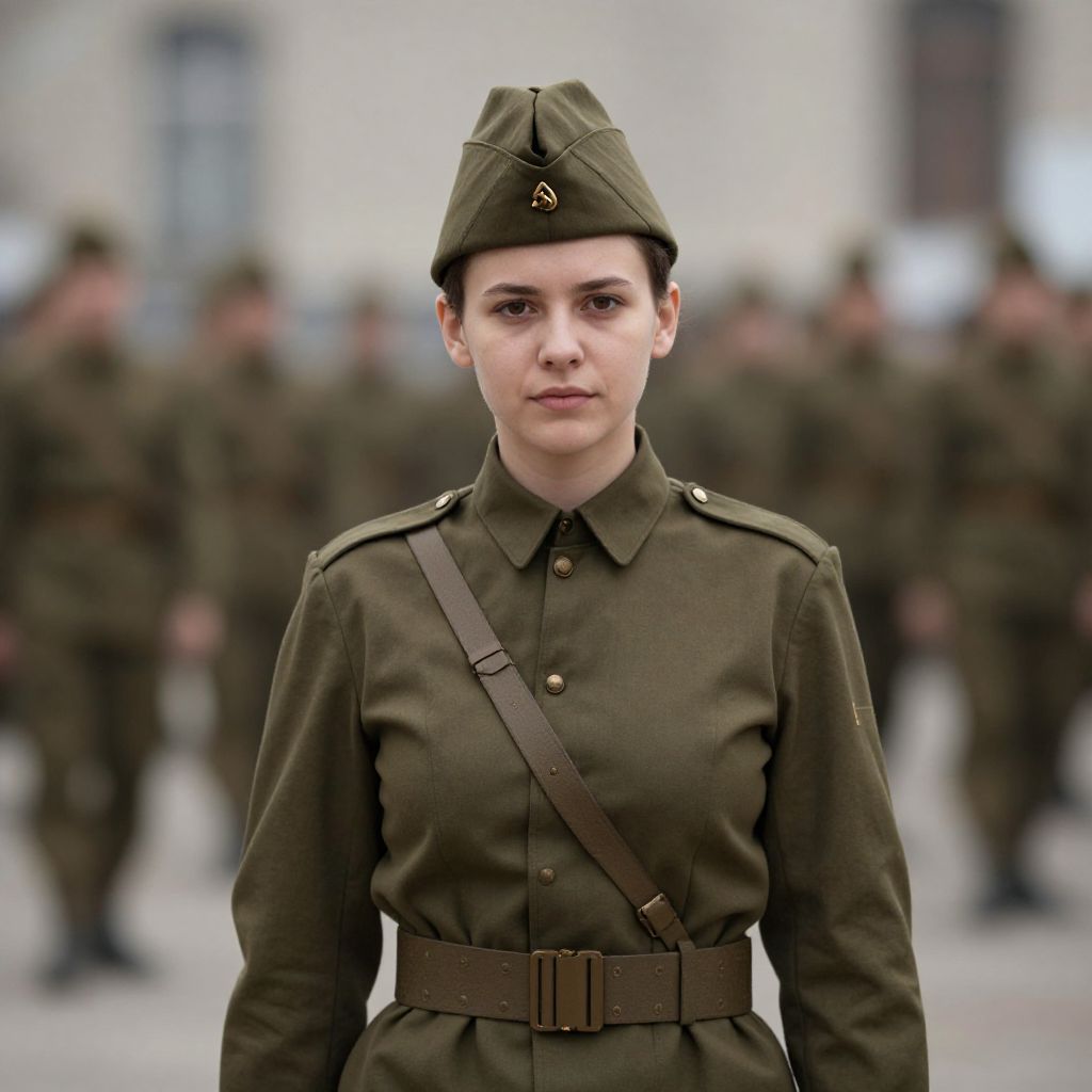 Photograph of a serious young woman in a World War II-era military uniform with green jacket and hat, standing in front of a blurred background of other