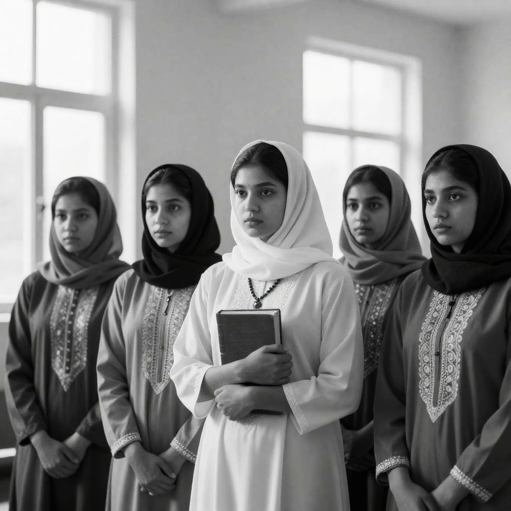 Black and white photograph of two people. Elderly man with bald head, long beard, open mouth, looking up at younger woman. Young woman with dark headscarf, serious expression, leaning towards elderly man. Background with light-colored curtain.