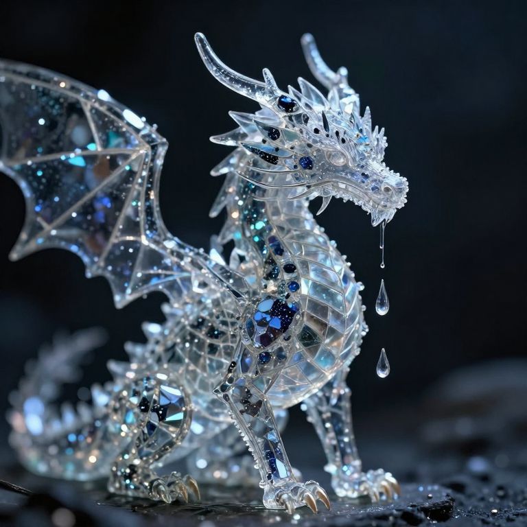 Photograph of a glowing, crystal dragon sculpture with intricate details, blue and white lights, and water droplets hanging from its mouth, set against a