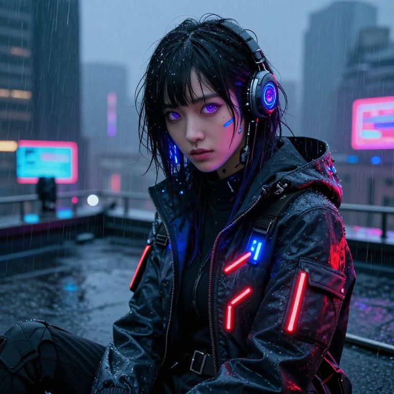 Close-up of a cyberpunk girl with deep violet eyes and a cybernetic eye glow, wearing a futuristic combat jacket with embedded LED strips that light up in bright electric blue and crimson, sitting on a rooftop in a rain-soaked metropolis with electric rain and holographic signs flickering in the distance.