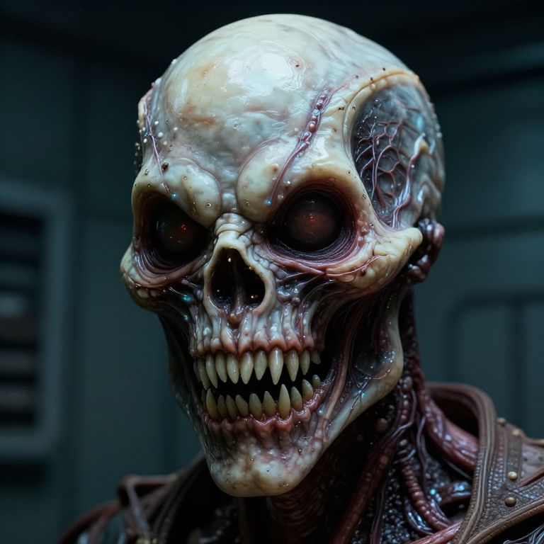 This is a highly detailed, digital CGI image of a grotesque humanoid skull with a partially intact face, displaying a sinister smile with exposed teeth. The skull has a glossy, almost translucent texture with visible cracks and patches of exposed bone. The eye sockets are dark and empty, giving an eerie look. The background is a dimly lit, industrial-style room with blurred, indistinct machinery. The color palette is dark and moody, with shades of gray and black dominating the scene. The skull's neck is partially visible, showing a leather-like texture with metal elements.