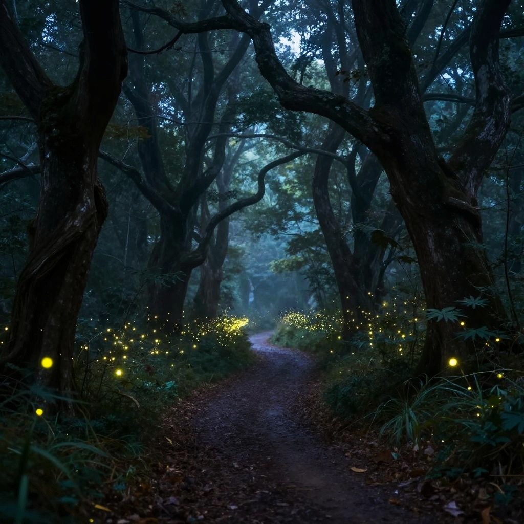 Midjourney cinematic prompts capturing a mysterious forest path at twilight, glowing fireflies illuminating the mist, ancient trees with twisted branches, magical realism style, rich textures, soft ambient light, immersive and atmospheric scene.