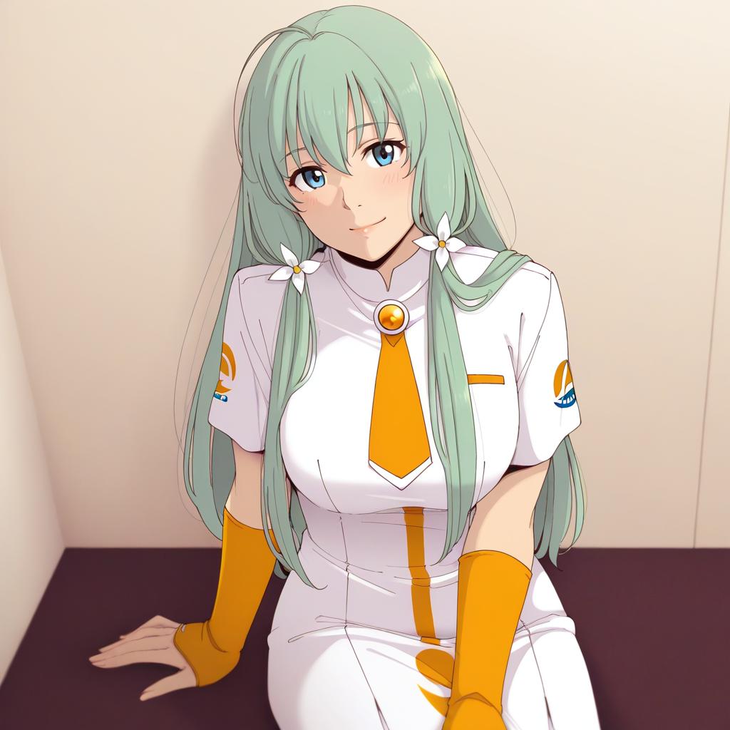Alice carroll, aria (manga), 1girl, blue eyes, green hair, long hair, orange planet uniform, uniform, orange planet uniform, uniform, white dress, long dress, by artist hanpetos, illustrious