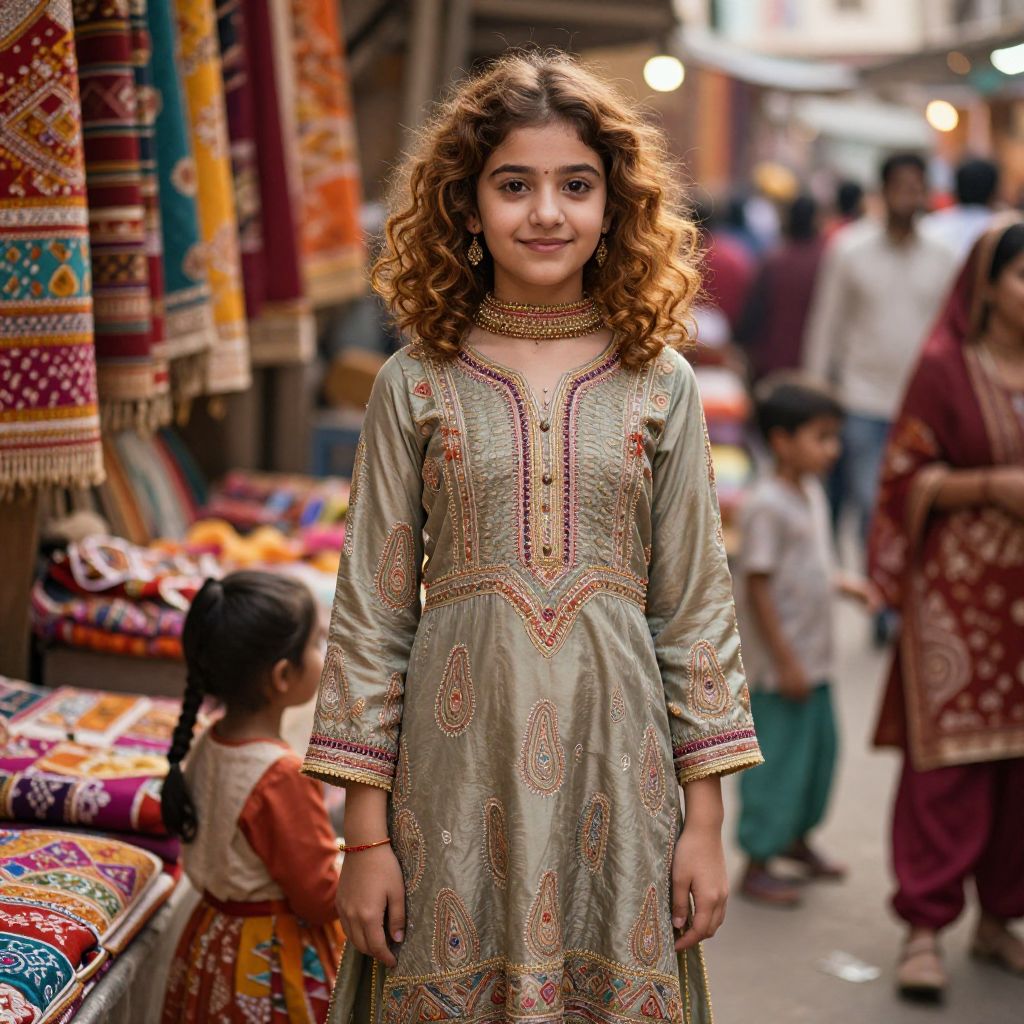 Punjabi suit prompt for gemini girl: A detailed Punjabi suit with paisley patterns and hand-stitched zari details, worn by a Gemini girl with curly honey-brown hair, smiling in a lively market scene, surrounded by colorful textiles, saris, and children, warm ambient lighting, bustling energy, rich Indian cultural setting.