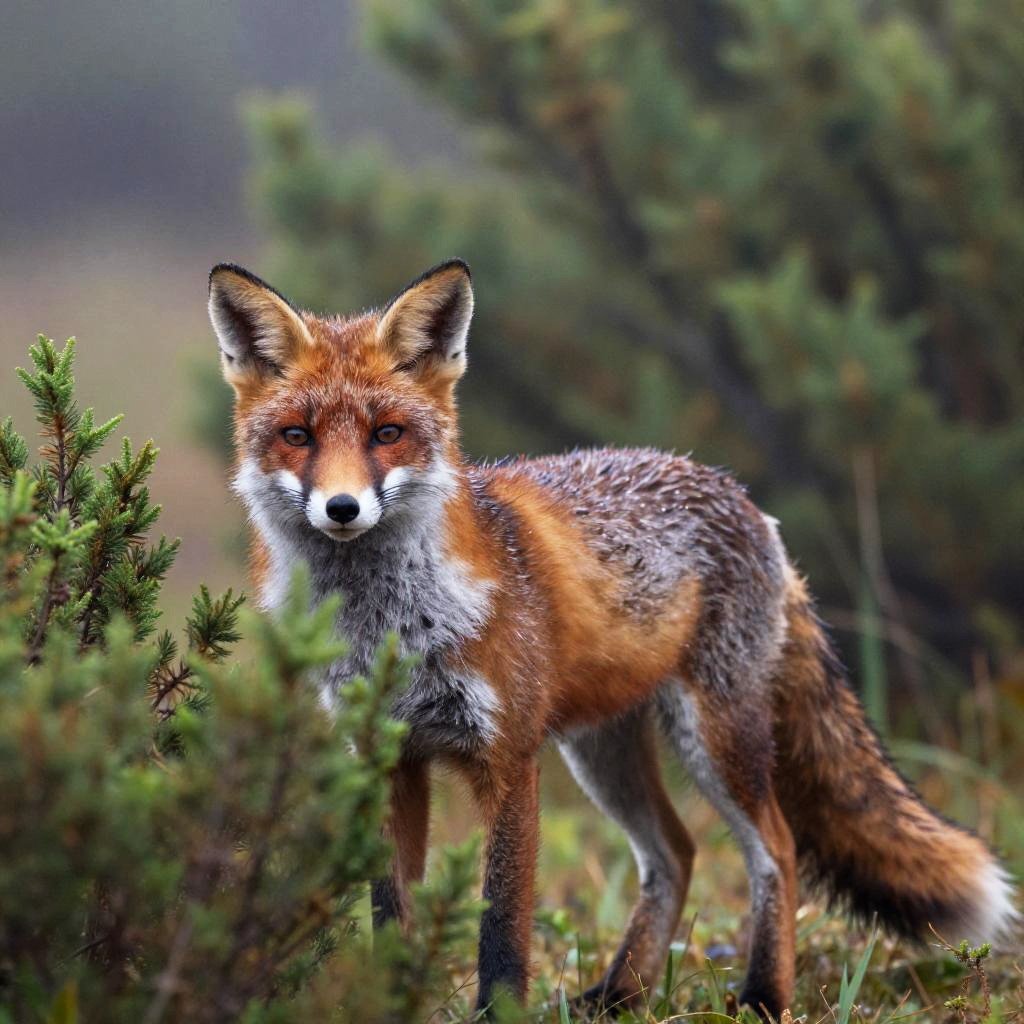 Fox pictures real, a fox peeking through dense green bushes in a misty forest, soft morning light filtering through trees, wet fur glistening with dew, photorealistic style, rich natural colors, capturing wildlife in its natural habitat