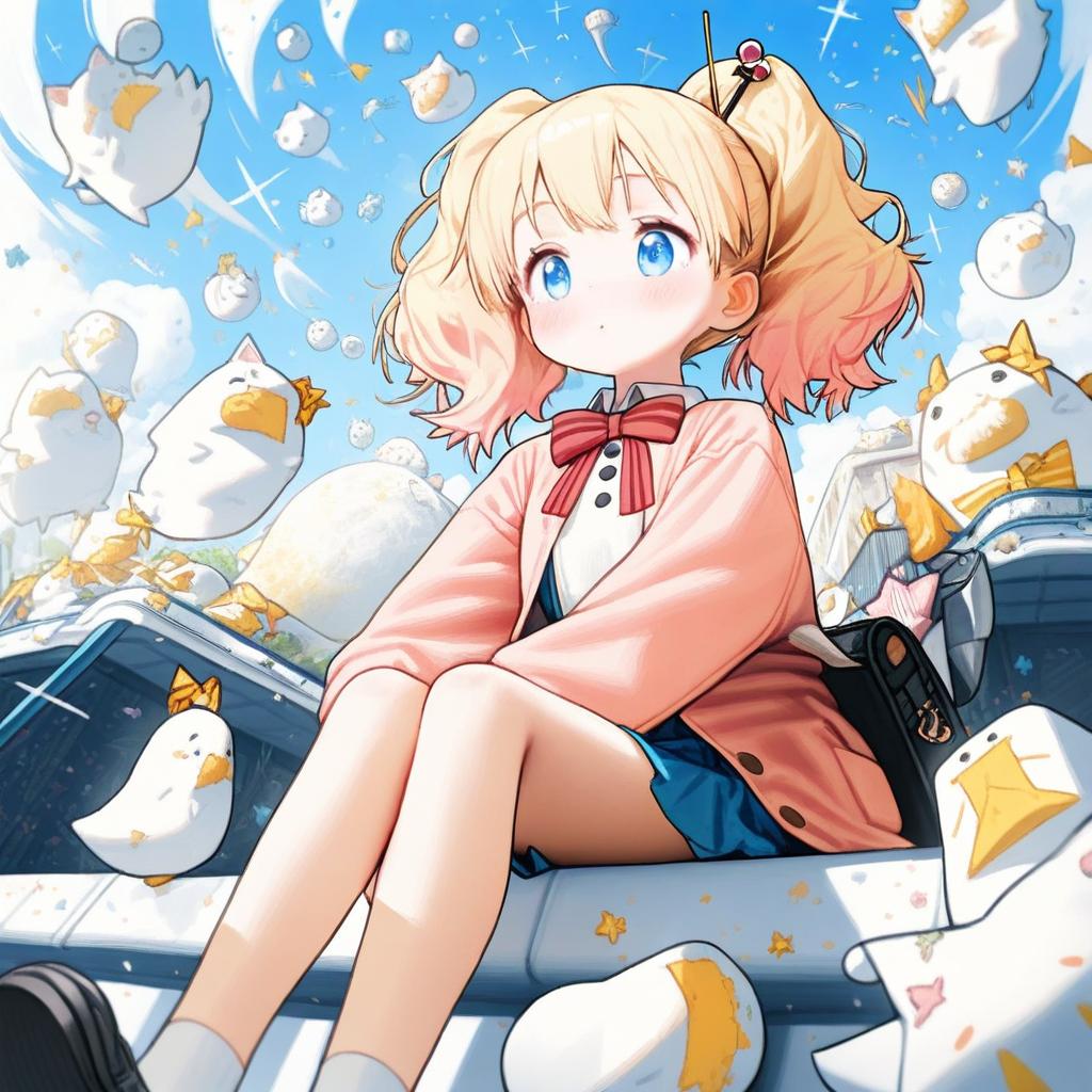 Alice cartelet, kin-iro mosaic, 1girl, blue eyes, blonde hair, short hair, long hair, twintails, school uniform, by artist rinotuna, animagine
