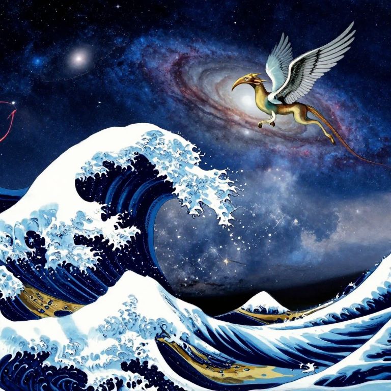 Visualize an awe-inspiring image blending the grandeur of Hokusai's oceanic waves with the surreal mystique of Dali's celestial landscapes. A monumental wave, painted in vibrant shades reminiscent of the abyssal depths, soars through a starlit sky adorned with distant galaxies. Its frothy crest mirrors an inverted cosmos, from which a solitary mythical creature emerges – wings outstretched as it navigates the vast expanse above. This scene embodies wonder and adventure, capturing both artistic inspirations in one high-resolution image that evokes an ethereal atmosphere with intricate details and sharp focus.