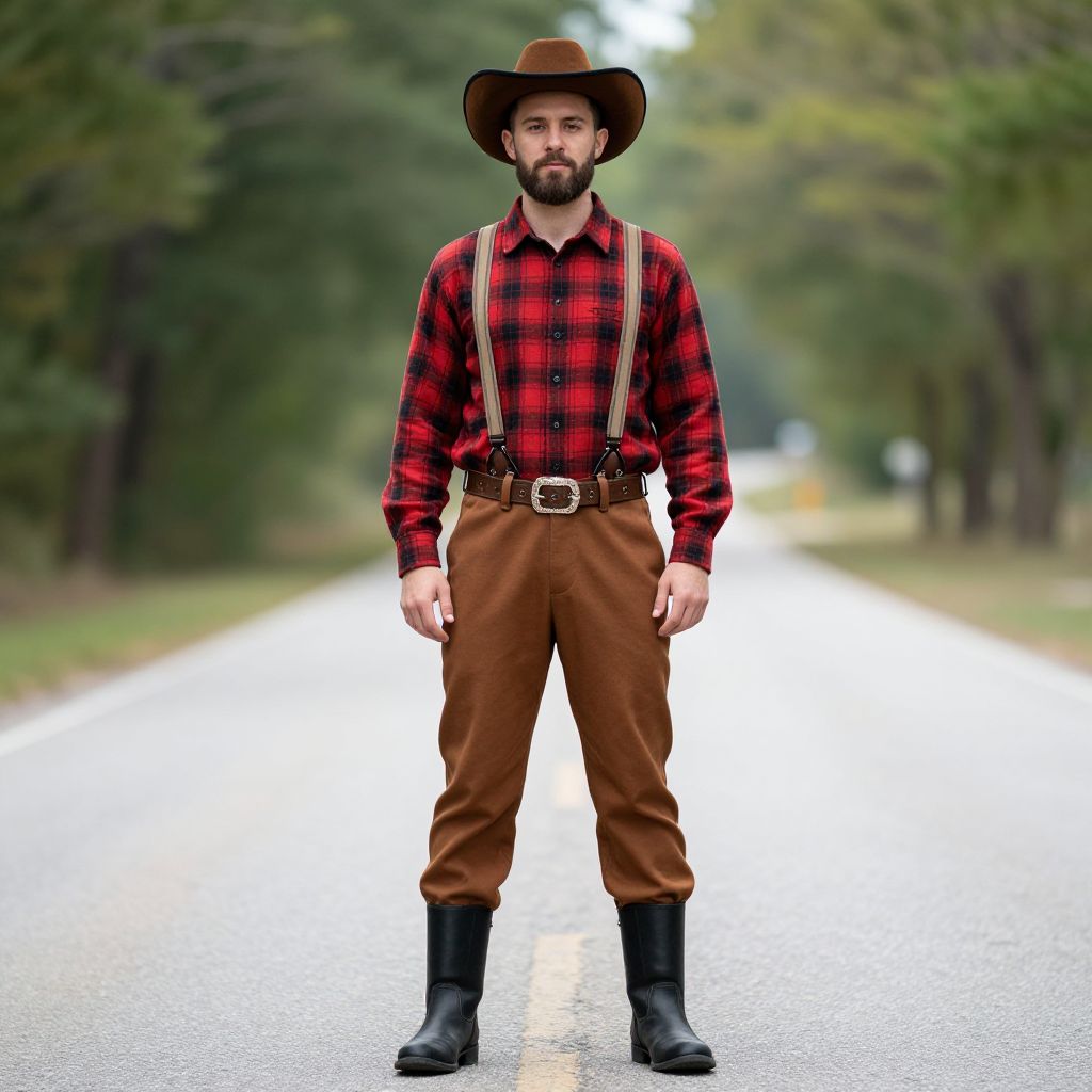 Flannel style man costume, 1boy, male focus, solo, plaid shirt, outdoors, shirt, hat, facial hair, brown pants, beard, pants, blurry, blurry background, full body, boots, suspenders, standing, red shirt, plaid, cowboy hat, tree, looking at viewer, road, day, collared shirt, belt, black footwear