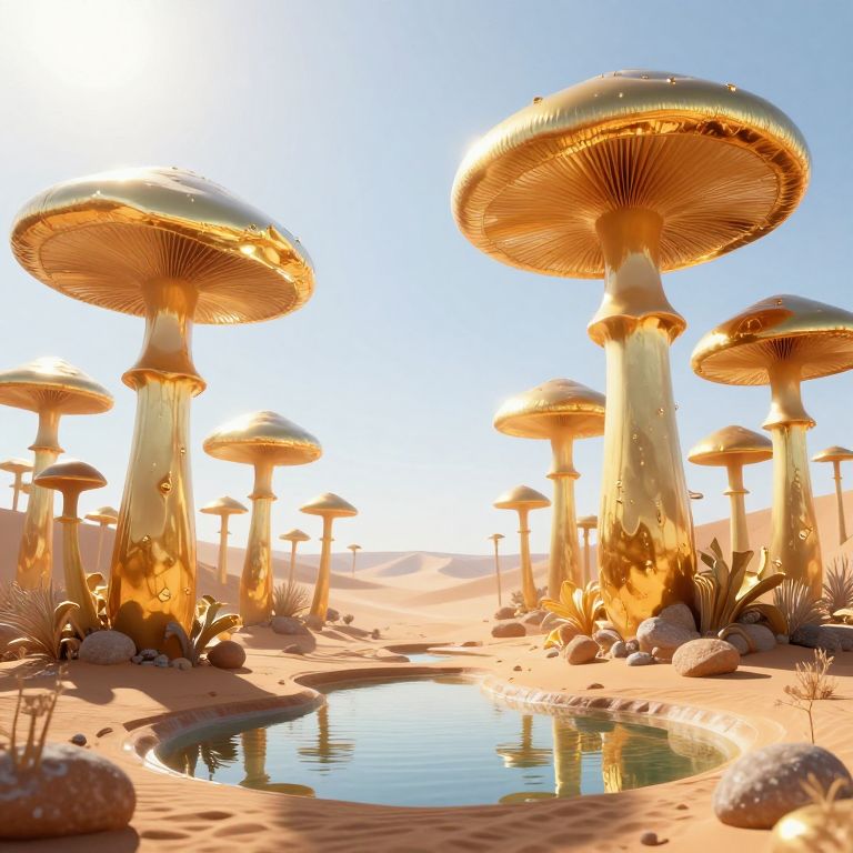 In a surreal desert landscape, a forest of towering, golden mushroom-like structures with reflective surfaces stands beside a tranquil oasis, each mirror-like cap capturing glimpses of alternate futures under the bright, ethereal light of a cyberpunk-inspired, high-definition digital rendering.