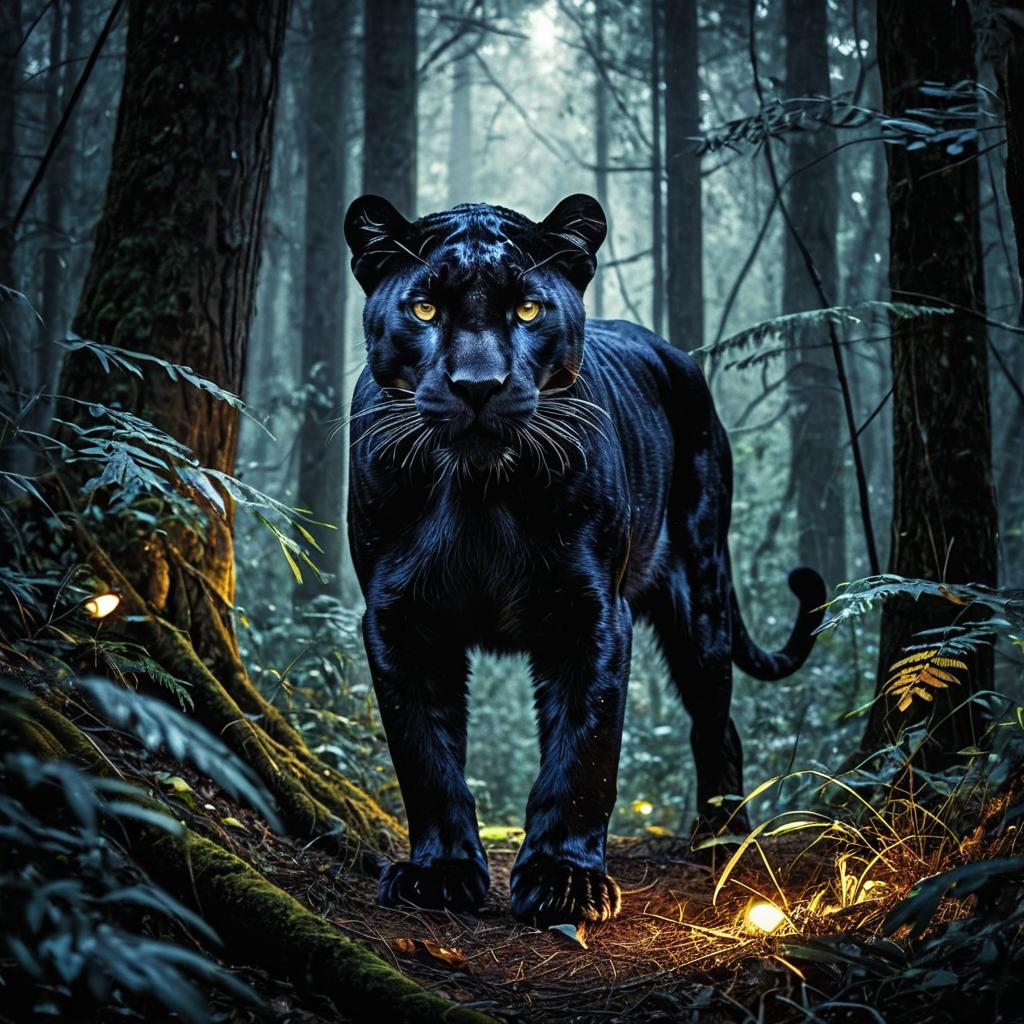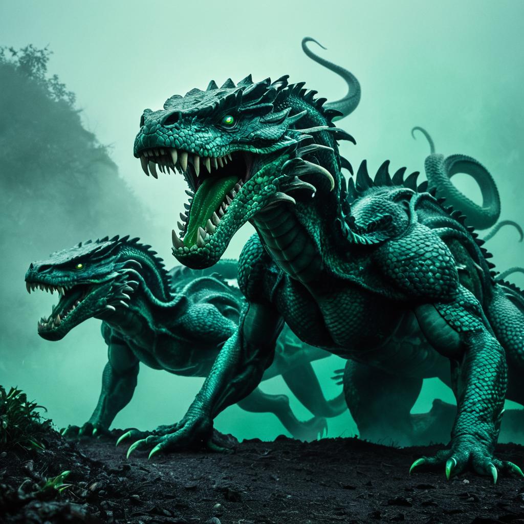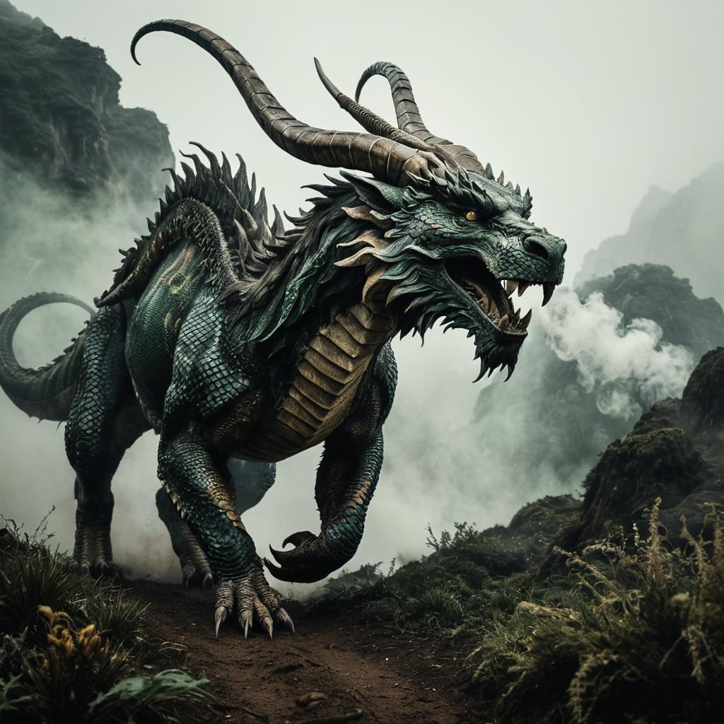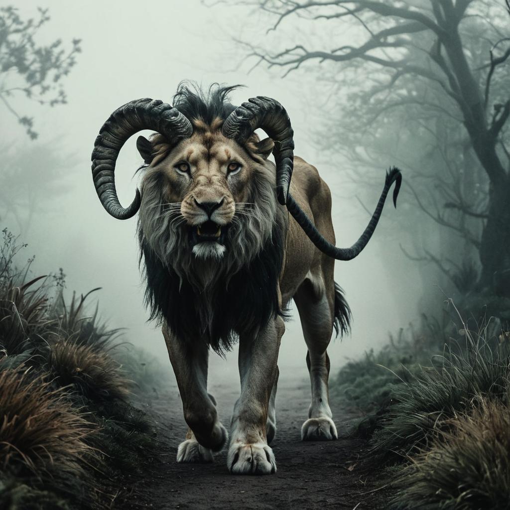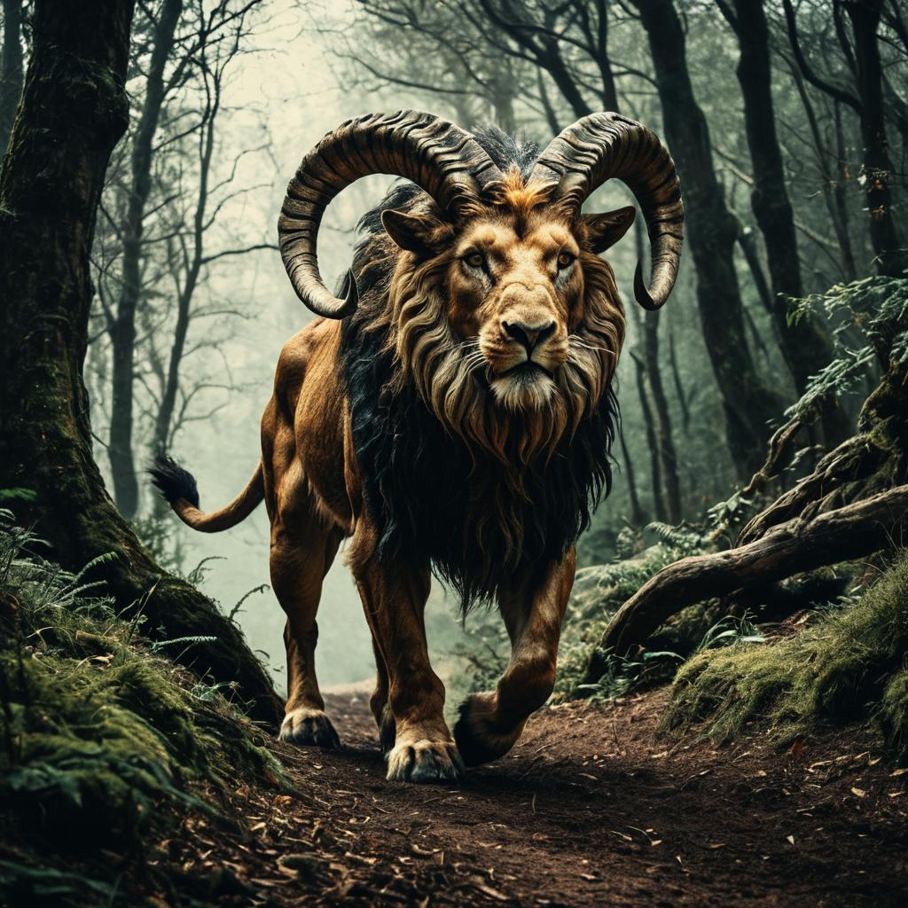 Mythical Beast with Lion Head and Goat Horns in Forest