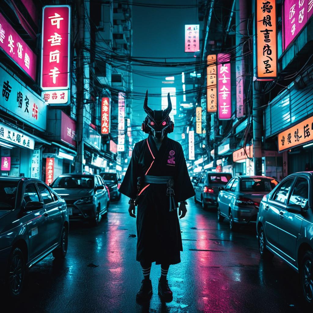 Cyberpunk Yokai in Neon-Lit Bangkok Street