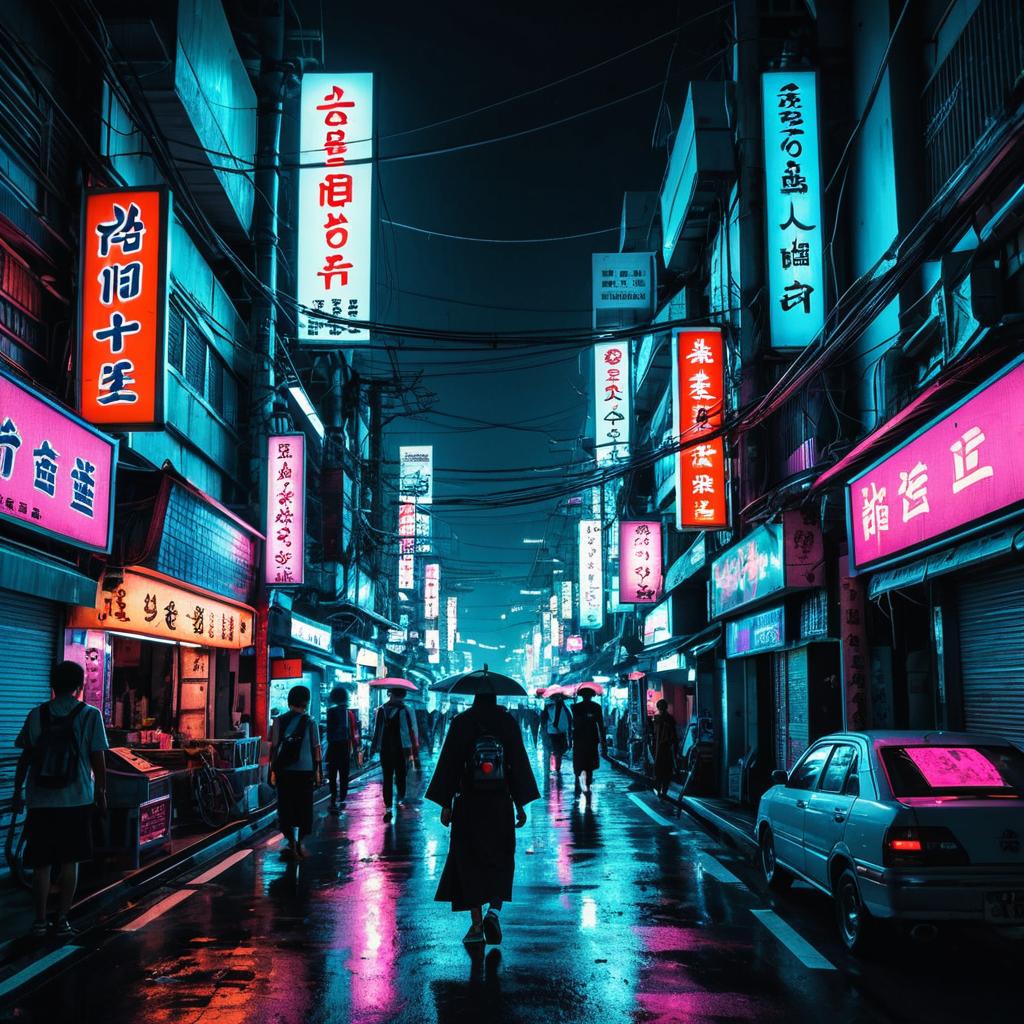 Cyberpunk Yokai in a mixture of technology and mythology, roaming neon-lit streets of Bangkok, blending ancient Japanese mythology with futuristic elements, tense and dangerous atmosphere, neon lighting casting eerie shadows, inspired by cyberpunk aesthetics