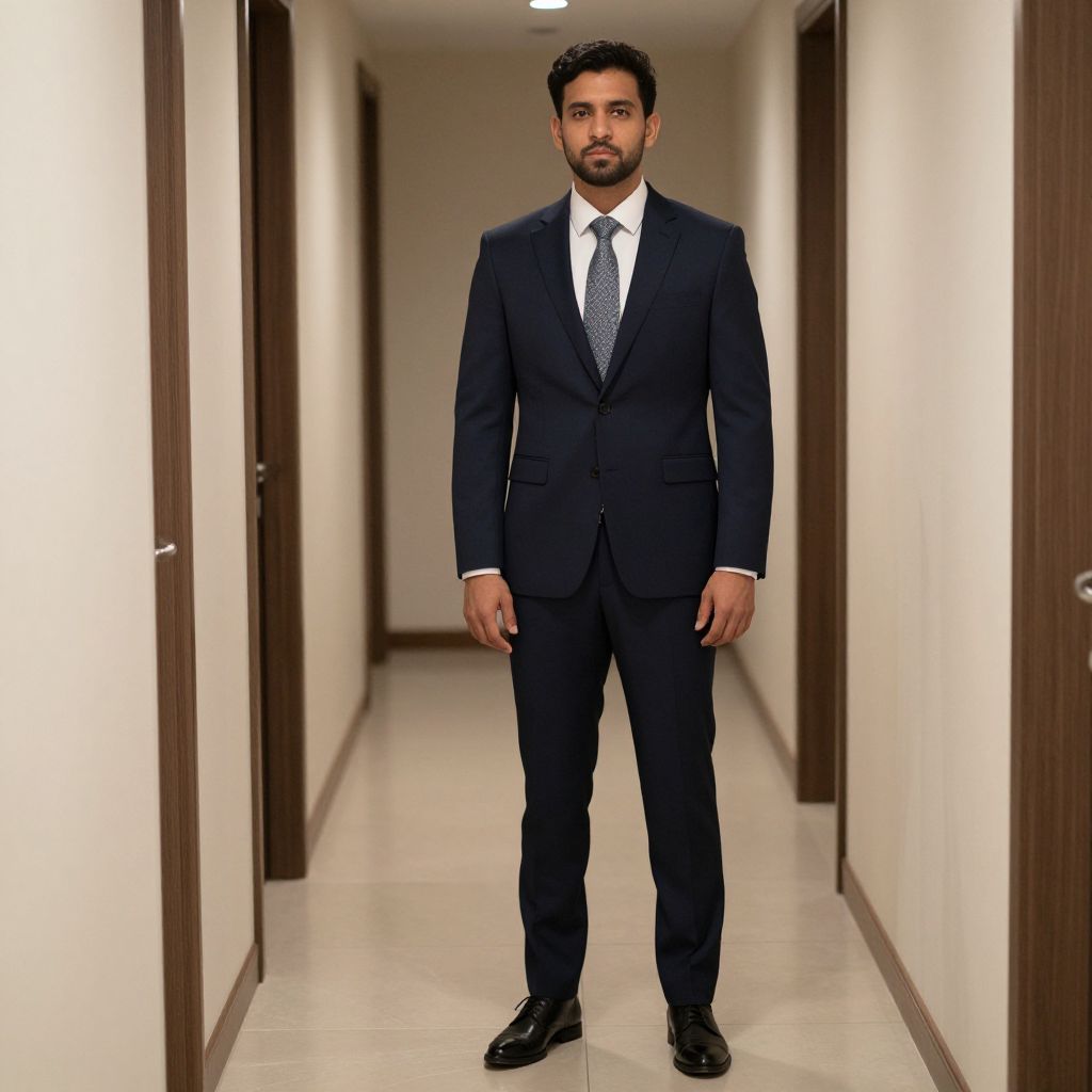Interview Attire Costume, man in a suit standing in a hallway with a tie