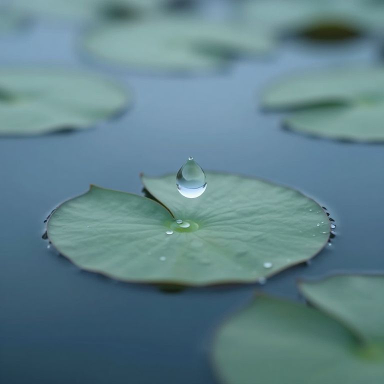 Suspended in a serene expanse of water, a solitary, ethereal droplet emerges as a symbol of infinite possibility, cradled by lily pads that whisper ancient stories of renewal and reflection, inviting contemplation amidst the quiet embrace of nature.