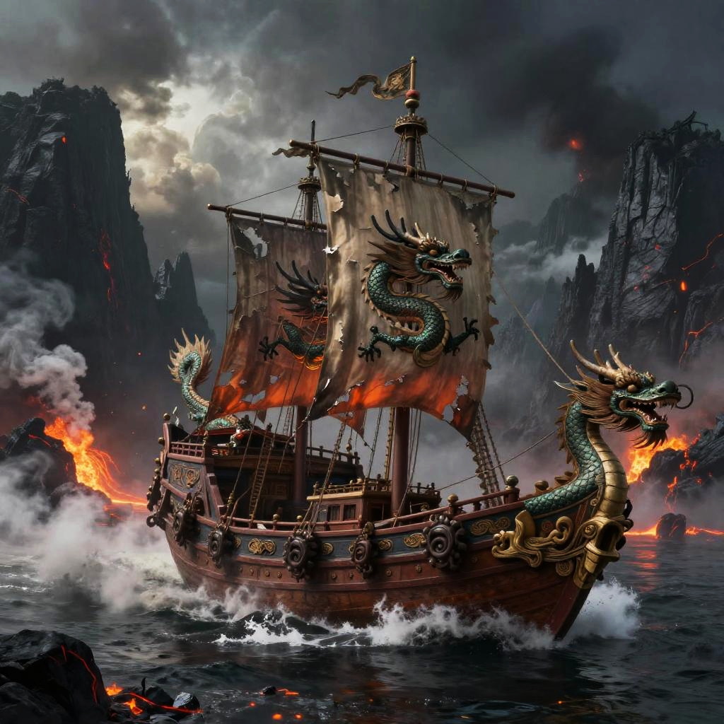 Imperial Dragon Junk Amid Volcanic Archipelago