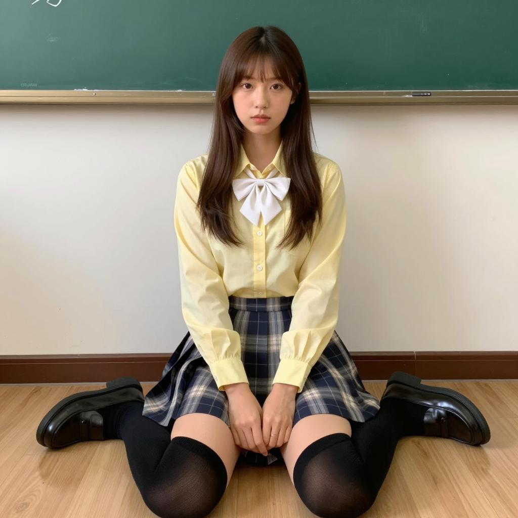 Asian woman with long brown hair, wearing a white sailor uniform with a blue necktie and black pleated skirt, kneeling on a wooden desk in a classroom. Green chalkboard in background. Hands on desk, legs folded beneath. Neutral facial expression. Black knee-high socks. School setting.
