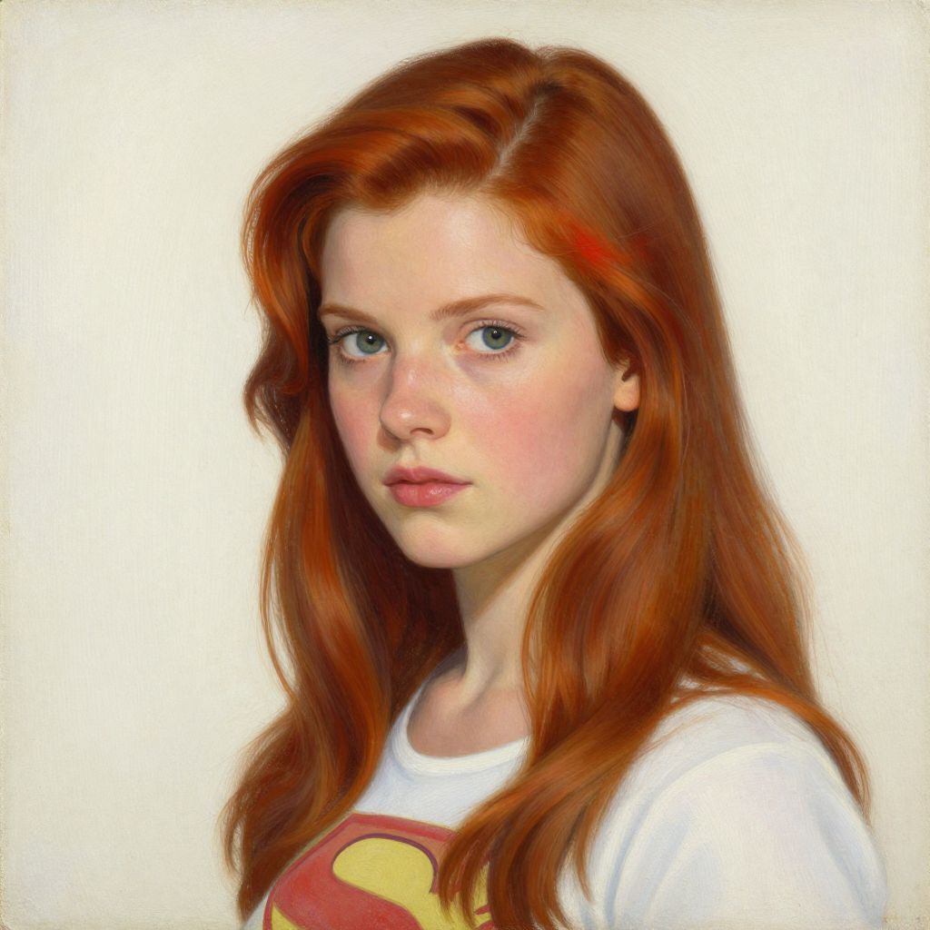 Digital drawing of a red-haired woman with wavy hair, fair skin, wearing an off-shoulder white dress, set against a detailed, mon