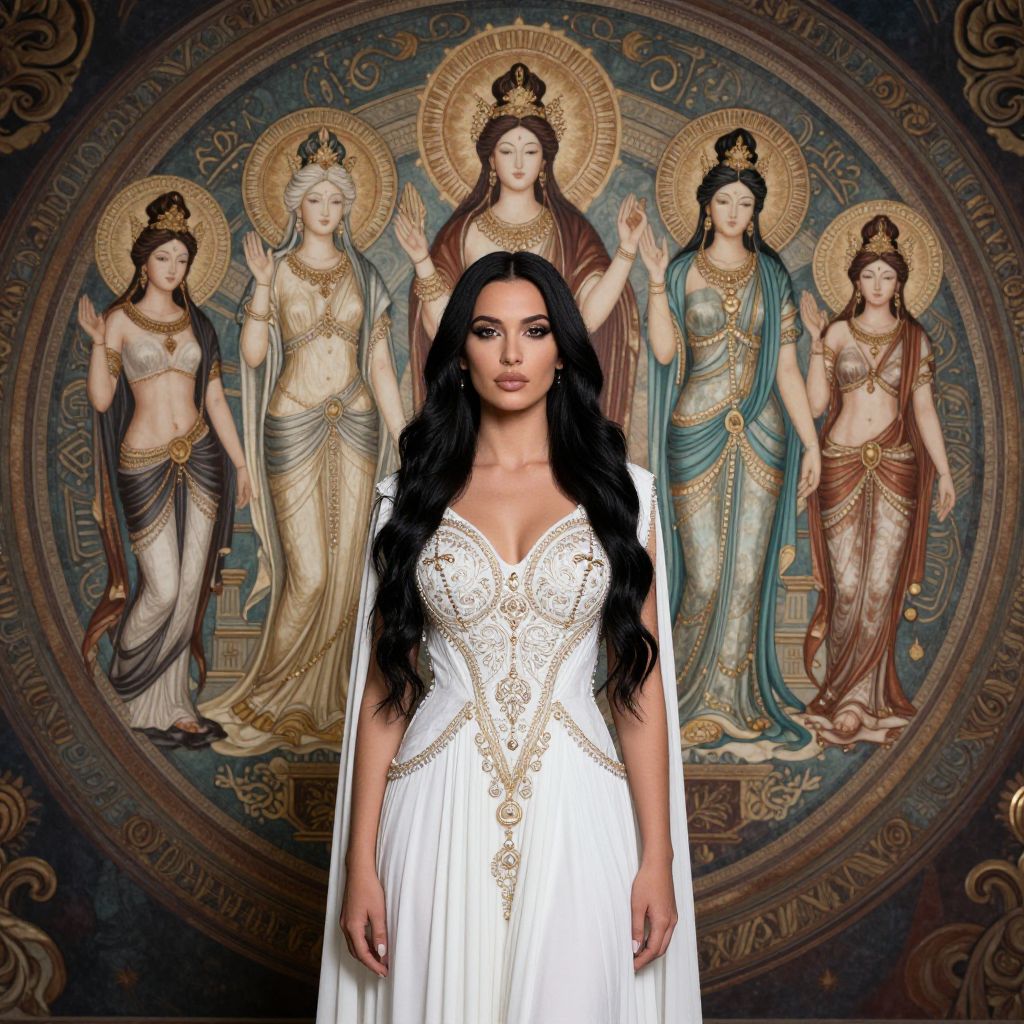 Photograph-style digital art features a dark-haired woman with long, wavy black hair and tan skin, wearing a white, intricately embroidered, low-cut dress with gold accents. She stands in the foreground, centered, against a circular, ornate backdrop of five goddess-like figures in traditional Indian attire, each with gold halos and intricate jewelry, standing in a semi-circle behind her. The background has a rich, dark blue and gold pattern, with symmetrical, decorative elements surrounding the goddesses. The overall composition evokes a sense of divine presence and ethereal beauty.