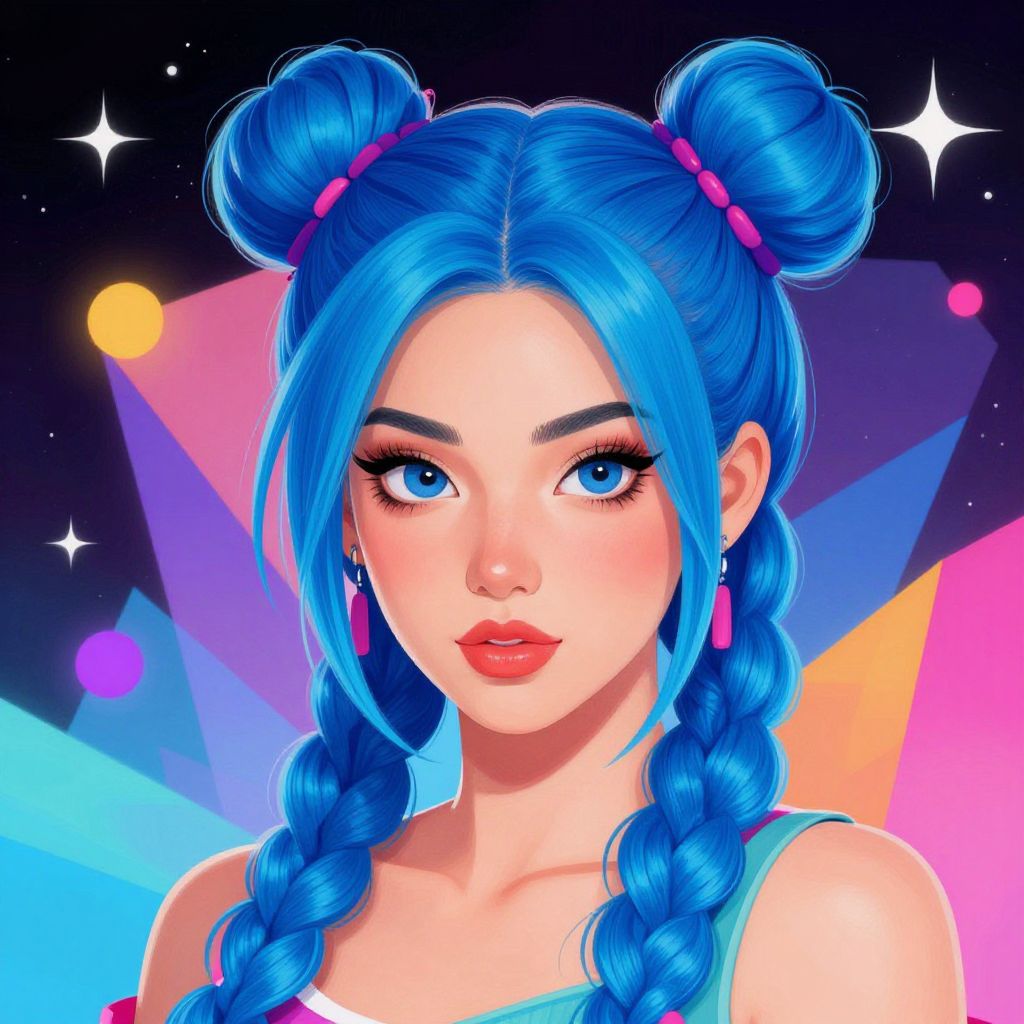 This is a digital illustration of a young woman with vibrant blue hair styled in two high buns, each adorned with pink hair ties. Her hair also has two long braids hanging down her front. She has striking blue eyes, thick black eyebrows, and full pink lips. She wears pink square earrings and a light blue tank top. The background features a starry night sky with colorful, geometric shapes in blue, orange, and pink, creating a lively, futuristic atmosphere. The overall art style is highly polished and vibrant, with a focus on bold colors and sharp contrasts.