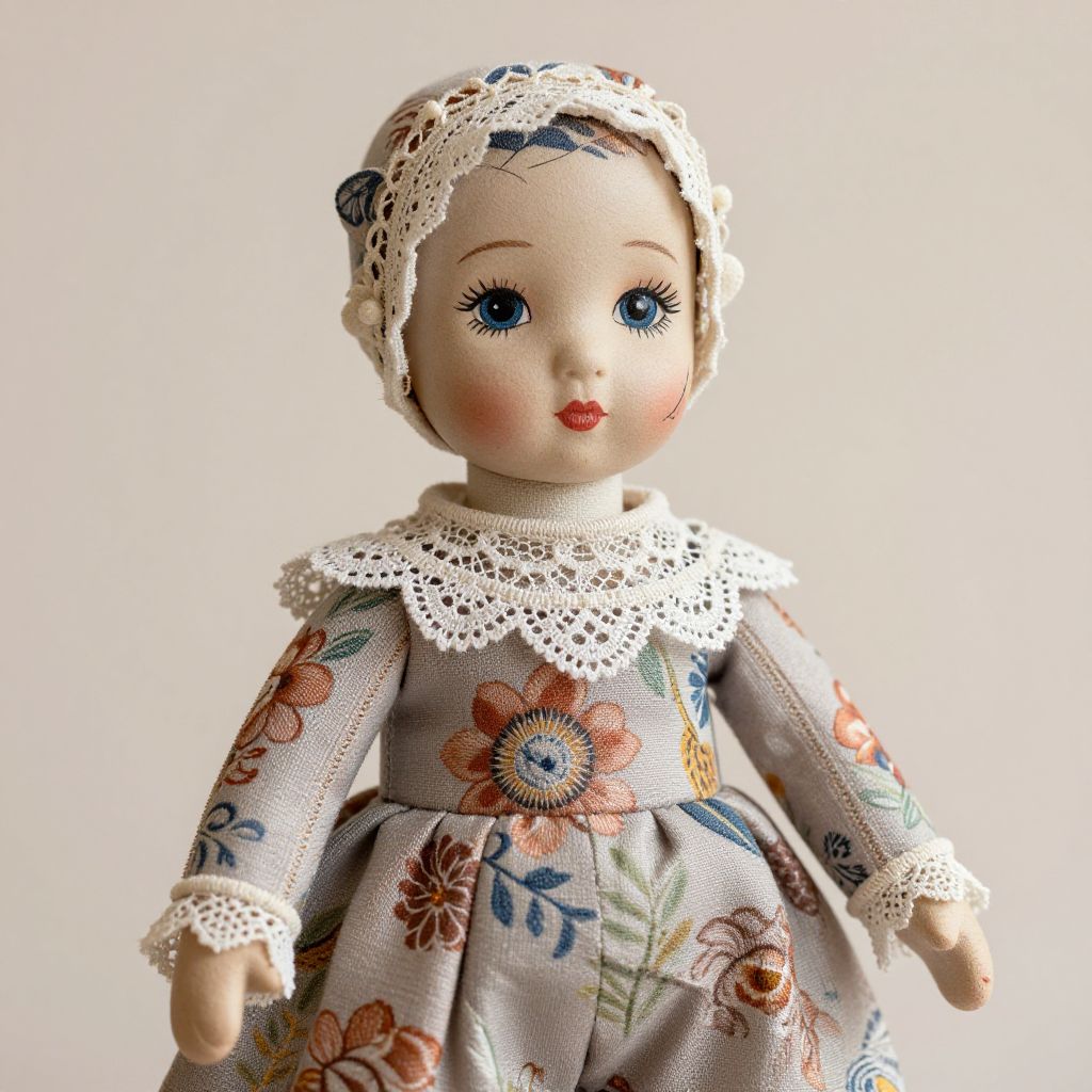 Modepuppe adorned with intricate hand-painted patterns and delicate lace accents, set against a muted pastel background, emphasizing texture and detail, artistic and elegant composition.
