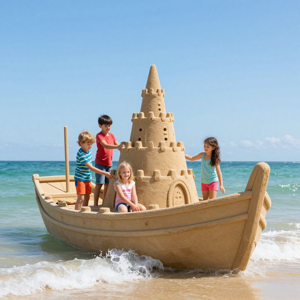 Four children joyfully play aboard a large, intricately crafted sandcastle boat floating on shallow turquoise waters, as gentle waves lap against its base under a clear blue sky.