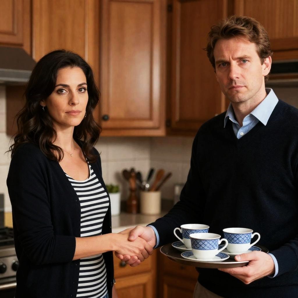 Photograph of two people in a kitchen. Woman with dark, wavy hair, wearing a black cardigan and striped top, shaking hands with a man with light brown hair, wearing a black sweater and light blue shirt. He holds a tray with three blue-and-white patterned teacups. Wooden cabinets and tiled backsplash in the background. Intense, serious expressions.