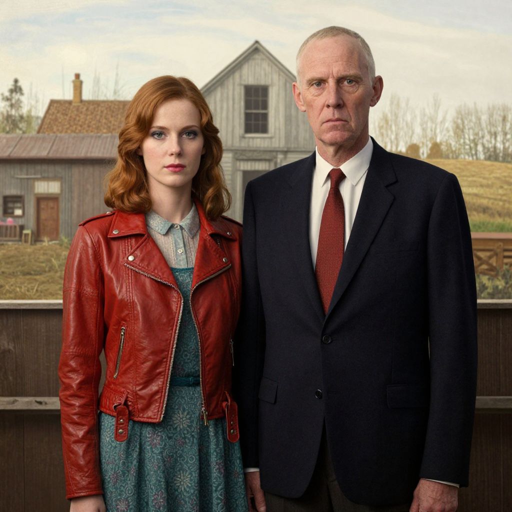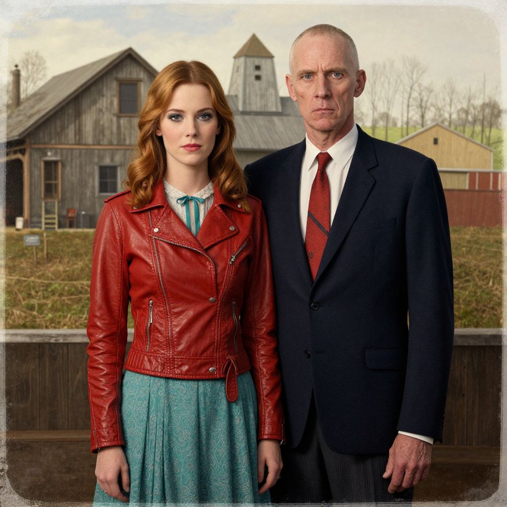 A modern reinterpretation of the iconic \"American Gothic\" painting, featuring a stylishly dressed couple in a field, with the woman wearing a red leather jacket over a teal dress and the man in a sharp navy suit with a red tie, set against a rustic backdrop with dramatic lighting and a vintage filter effect.