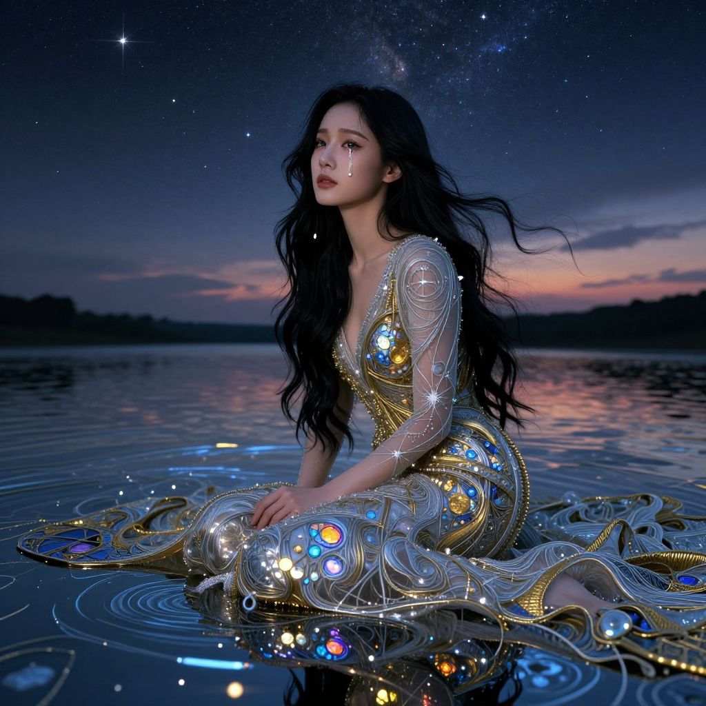 A captivating portrait intertwines the surreal dreamscapes with intricate digital artistry, as a stunning woman of Korean descent sits beside a shimmering pond reflecting the starlit sky above. She dons an elaborate, ethereal gown woven from threads of silver and gold, adorned with celestial symbols that glisten and dance in the ambient light. Her long, dark hair flows like ink against her fair skin, while a single tear refracts the luminescence into a spectrum of colors, evoking both sorrow and hope. As she gazes into the water's surface, her eyes seem to pierce through the veil between worlds, revealing enigmatic realms beyond our perception. The twilight setting bathes the sky in hues reminiscent of stained glass, creating an atmosphere that is hauntingly beautiful and deeply symbolic, inviting viewers on a journey through dreams, memories, and the infinite reaches of imagination.
