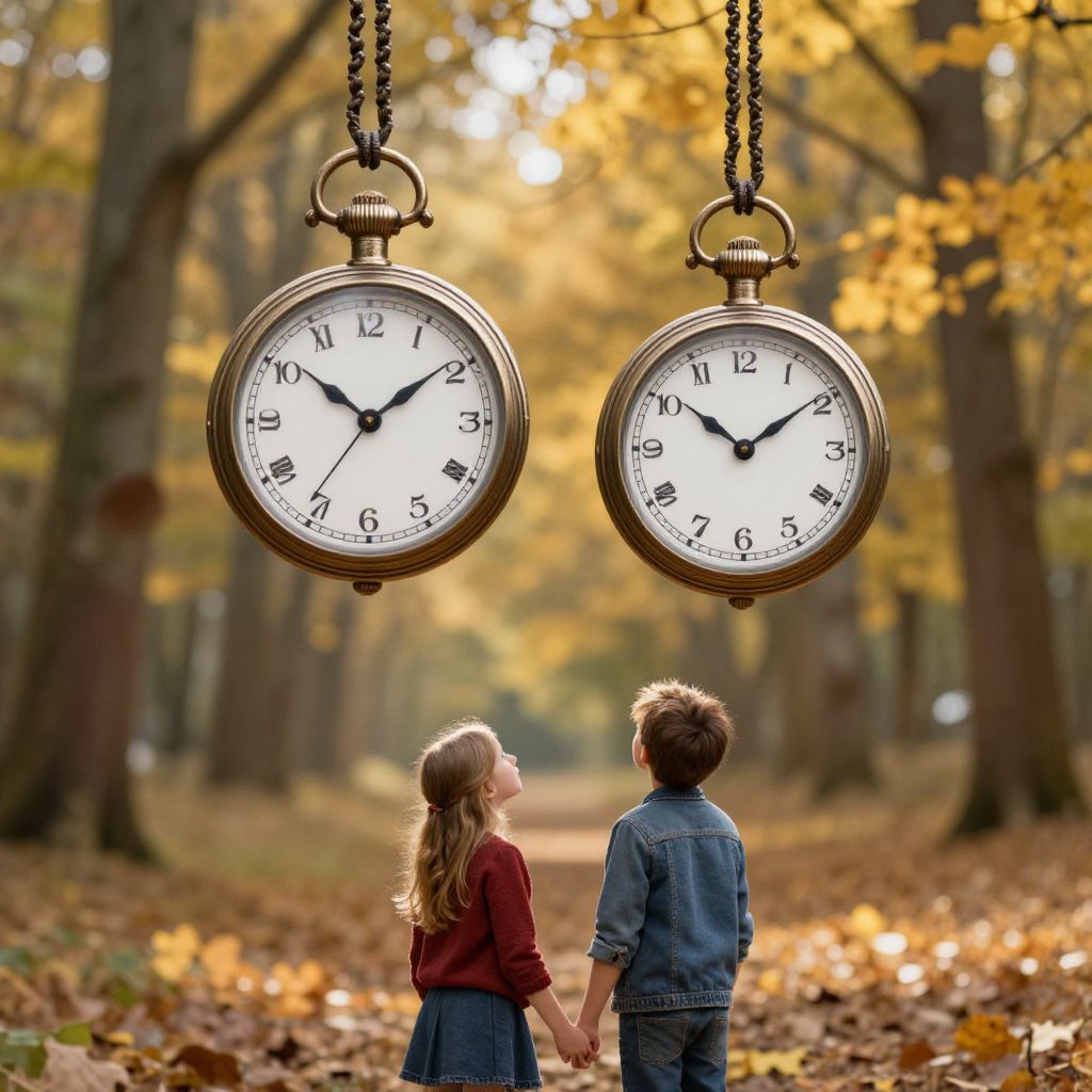 Two vintage pocket watches hang from chains above a serene forest glade, their hands ticking backwards as two children, hand-in-hand, gaze upward in wonder beneath the dappled sunlight filtering through golden autumn leaves.