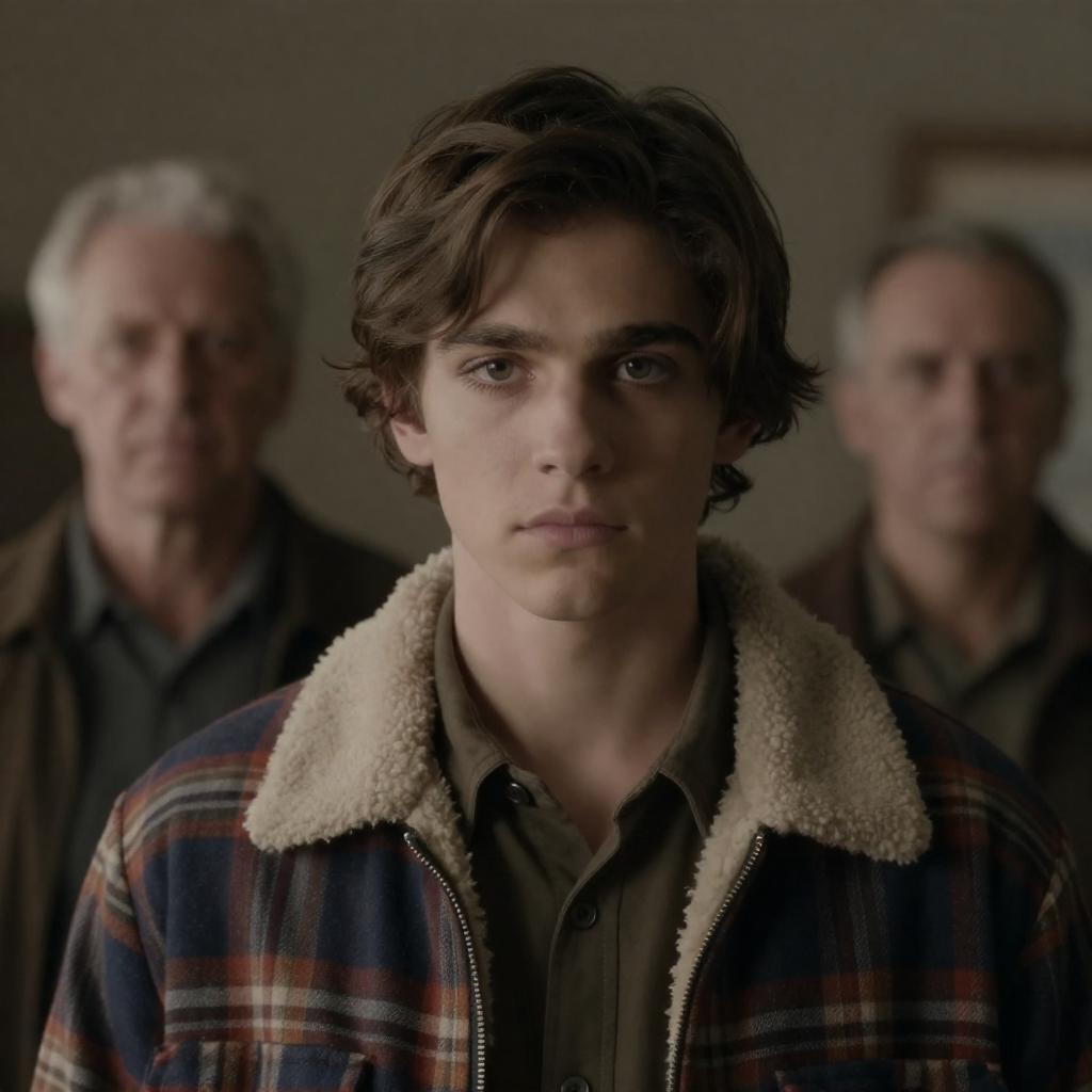 Photograph of two men in a wooden cabin. Left: young man with blonde hair, blue eyes, smiling, wearing a patterned shirt. Right: older man with brown hair, intense expression, shirtless. Wooden walls in background, window on right.