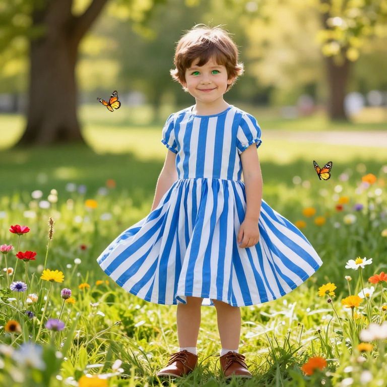 A cheerful young boy with short brown hair, bright green eyes, and a slightly mischievous smile, wearing a vibrant blue and white striped dress that features a flowing, full skirt and cozy brown leather shoes. He stands confidently in a sunny meadow, smiling gently at the camera, with soft sunlight dappling through the trees in the background. Wildflowers bloom in colorful patches, and a few butterflies flutter nearby. The scene is warm, vibrant, and playful, highlighting his innocent, energetic, and joyful personality, with a touch of whimsy and natural charm.