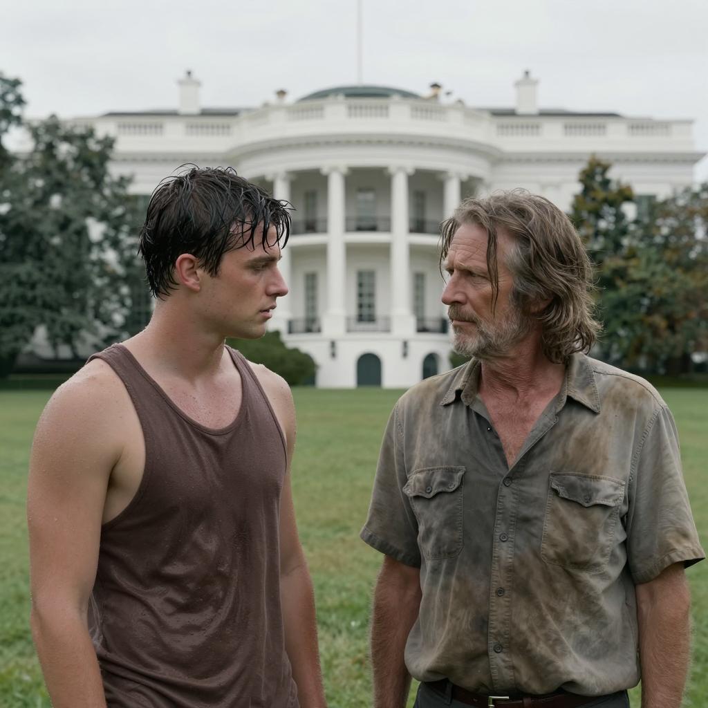 Photograph of two men outdoors. The older man, with short brown hair, tan suit, white shirt, gold chain, and gold watch, leans on the younger man. The younger man, with brown hair, red and gray raglan shirt, looks away. Background includes a white house and green trees. The older man's arm rests on the younger man's shoulder, his hand displaying a ring. The older man's expression is intense, while the younger man's expression is neutral.
