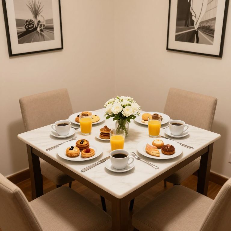 Cozy dining area in B&B Eco Pompei featuring a square table set for breakfast with three place settings, each adorned with white plates containing assorted pastries, orange juice, coffee cups, and floral decor, complemented by beige chairs and framed artwork on the walls.