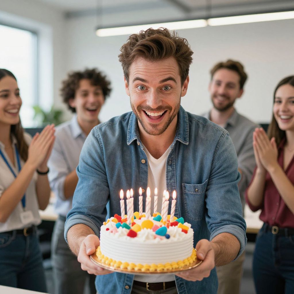 Candid moment: A beaming man celebrates his work anniversary, grasping a vibrant cake adorned with candles, amidst joyful colleagues in an open-concept office space. Soft natural light illuminates the scene, capturing genuine emotions and camaraderie among team members. High-resolution image, showcasing fine details of facial expressions, attire, and celebratory atmosphere. Man has masculine face and piercing eyes