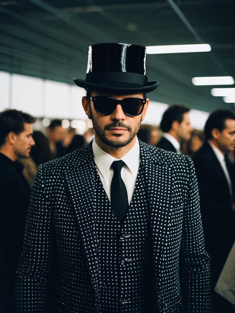 Man in Modern Fashion Costume, fashion event photo, photorealistic realism