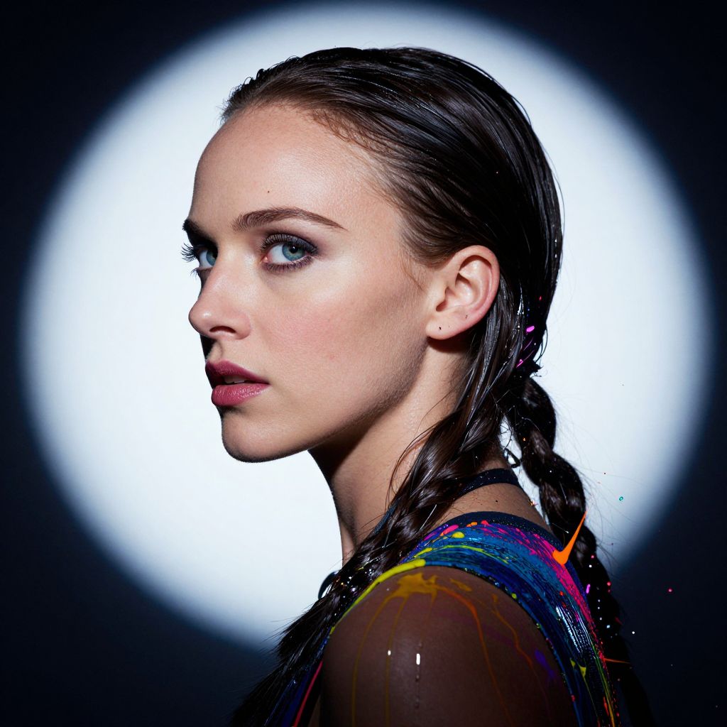 A cyberpunk goddess, side portrait, striking, defiant, spotlight, paint drips, paint splatter, vibrant colors, beautiful eyes, natalie portman, by marco paludet and gianni strino and marion bolognesi