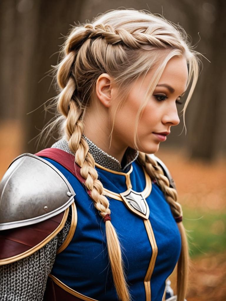 Photo-realistic portrait of a young woman with blonde hair styled in single braid and braided ponytail, wearing detailed Agrias Oaks-inspired blue knight armor with metallic shoulder plates. The image features natural warm lighting and a soft blurred background of autumn foliage.