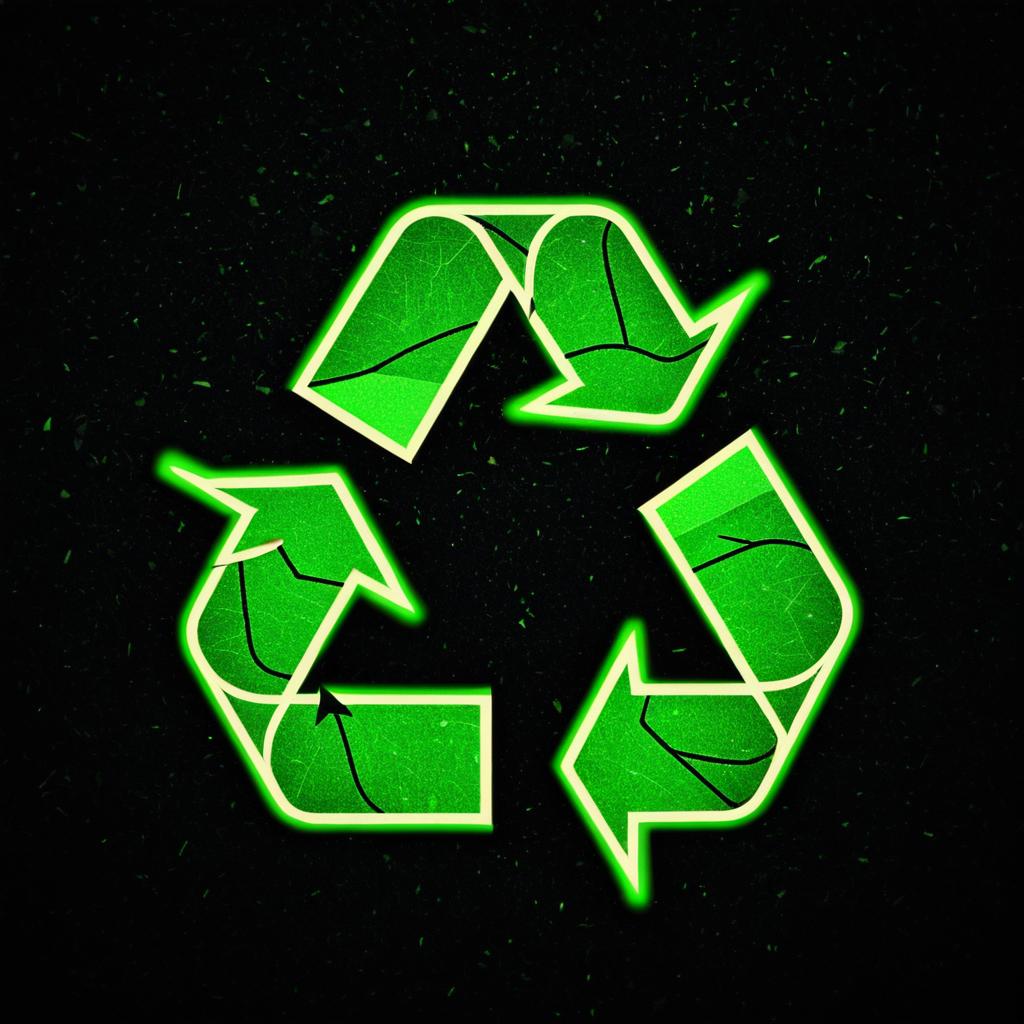 A green recycle logo with a black background. The arrows are electrified, glowing with vibrant energy