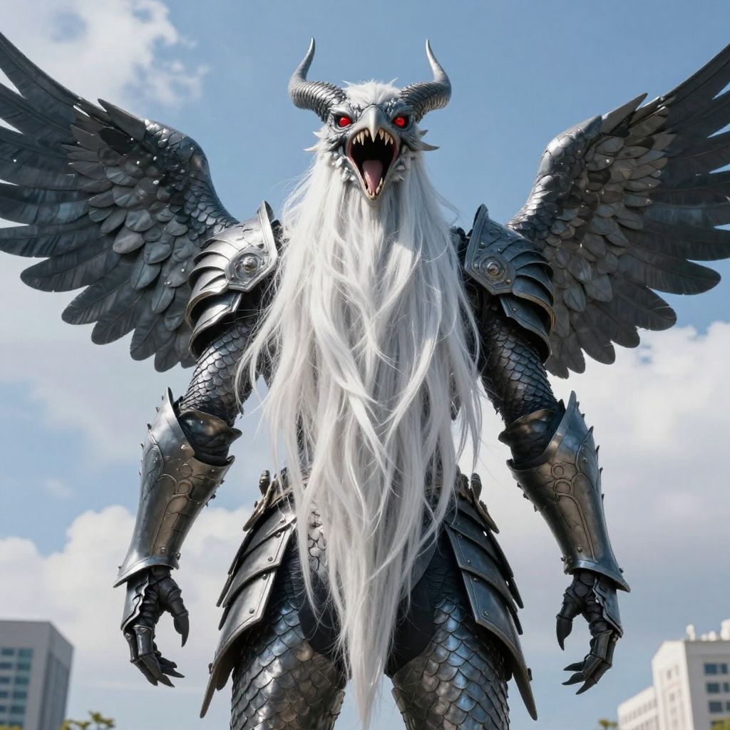 Best quality, masterpiece, ultra high res, nu no humans, (long:1.2), long hair, sharp teeth, red eyes, teeth, giant, 1girl, bird, outdoors, standing, scales, cloud, horns, from behind, armor, sky, open mouth, monster, size difference, white hair, building