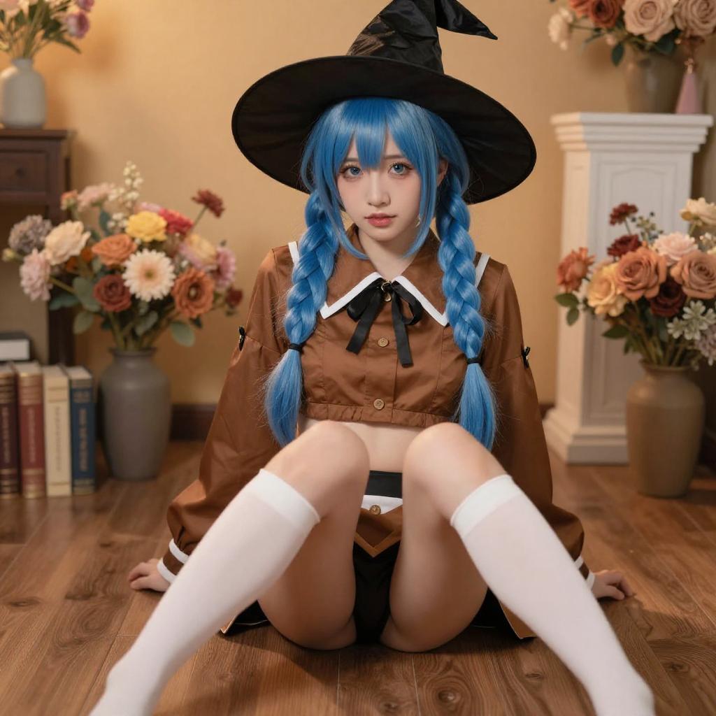 Digital artwork of a blue-haired anime girl in a black hat and white boots, sitting on a wooden floor with legs raised, exposing her bare thighs. She wears a tan coat, surrounded by books and flowers in the background. Her face is slightly tilted, and her black-soled boots are prominently in the foreground.