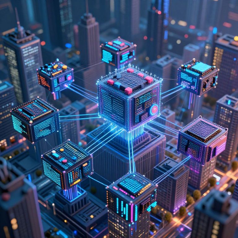 This is a digital CGI image of a futuristic cityscape featuring a network of glowing, neon-lit skyscrapers. Central to the image are six cube-shaped buildings interconnected by vibrant blue and pink neon lines, resembling a high-tech hub. The buildings are illuminated with colorful lights, predominantly blues and pinks, contrasting with the dark, shadowy cityscape in the background. The city has a mix of modern and slightly blurred skyscrapers, with some lights from distant buildings visible. The overall style is cyberpunk, with a high-tech, neon-infused aesthetic. The image has a dynamic, almost holographic quality, emphasizing the futuristic theme.