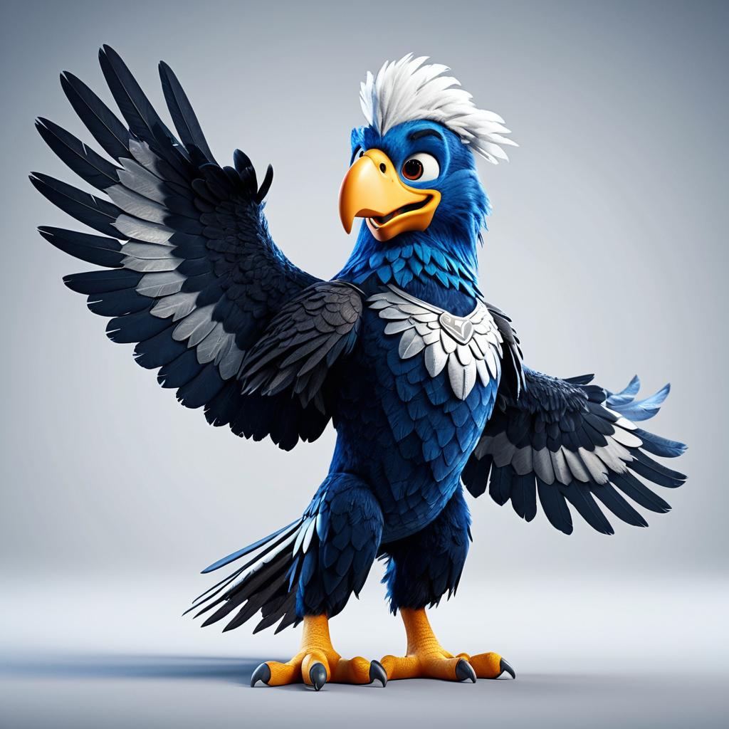 Disney Pixar character, 3D render style, eagle mascot with navy blue and silver feathers, standing with one wing raised, humanoid, cinematic colors