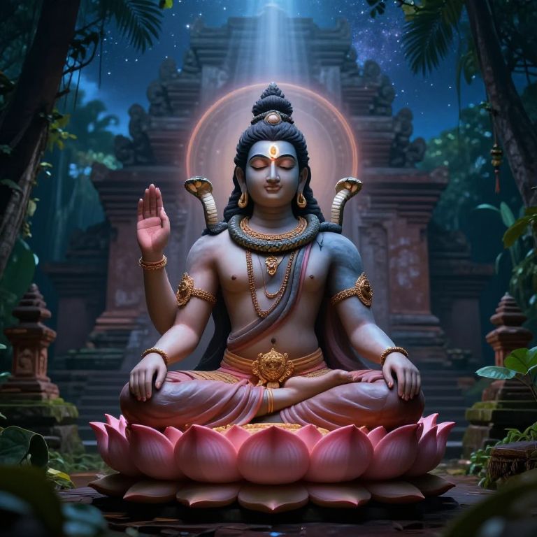 A vibrant statue of the Hindu deity Vishnu with blue skin, adorned in golden ornaments and a green dhoti, standing on a lotus base. The figure holds a mace and has multiple arms, symbolizing divine power. The statue is set against a lush, tropical background with cascading waterfalls and bright sunlight filtering through palm trees.