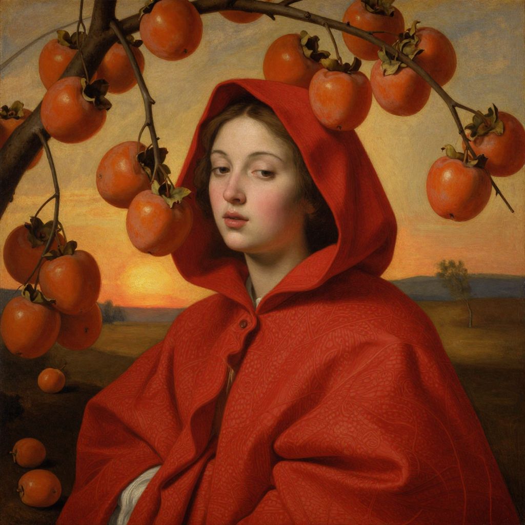 The image depicts a striking Baroque-style painting featuring a woman adorned with a vibrant, red hooded garment that is intricately detailed with folds and textures. The hood is decorated with large, ripe persimmons, adding a sense of abundance and natural beauty to the scene. The woman's face is serene and contemplative, with a soft, almost ethereal quality that contrasts with the earthy tones of the fruit. Surrounding her are numerous persimmons, both on the ground and hanging from branches, creating a dense, almost forest-like atmosphere. The background is a blend of warm, golden hues, suggesting a sunset or sunrise, with soft, diffused light that enhances the overall sense of tranquility and harmony. The composition is balanced, with the woman centrally positioned, and the persimmons framing her face and body, creating a sense of unity and cohesion. The interplay of colors, from the rich reds of the garment and fruit to the soft, golden tones of the background, creates a visually captivating and emotionally resonant scene.
