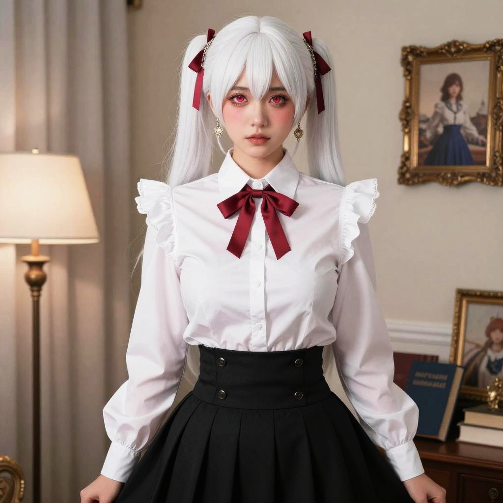 Score_9, score_8_up, score_7_up, best quality, masterpiece, realistic eye, gigantic breasts, cowboy shot, 1girl, solo, skirt, shirt, long sleeves, looking at viewer, jewelry, bangs, earrings, white shirt, lamp, ribbon, breasts, high-waist skirt, closed mouth, indoors, red ribbon, pleated skirt, buttons, medium breasts, twintails, neck ribbon, white hair, blush, collared shirt, bow, hair ribbon, puffy sleeves, red eyes, low twintails, puffy long sleeves, frills, pink eyes, black skirt, book, long hair, curtains, picture frame, blue skirt, medium hairrealistic background, Detailed Background