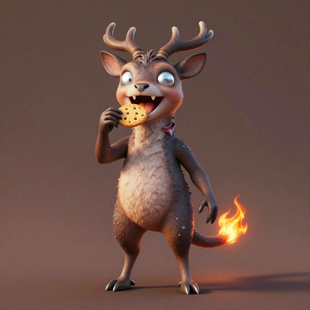 Full body, creature, solo, twilight stag creature, standing, looking at viewer, shimmering silver eyes, holding food, cookie, eating, open mouth, fangs, teeth, flame-tipped tail, claws, smile, happy, blush, tongue, scar, straight-on, brown background
