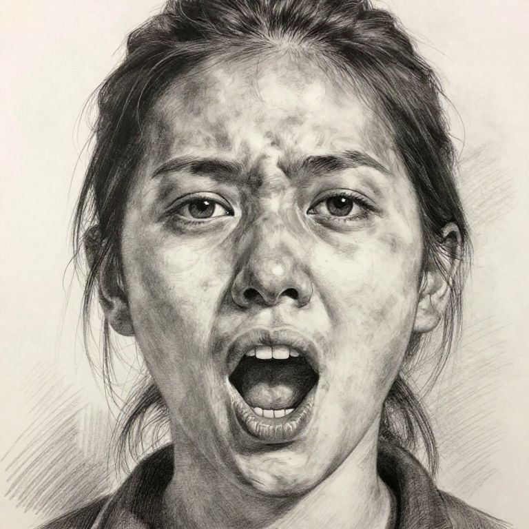 Person with mouth open drawing as a realistic pencil portrait, detailed shading and textures illustrating skin and hair, emotional intensity in eyes and open mouth, subtle background blur to keep focus on facial features, hyper-realistic with fine line work.