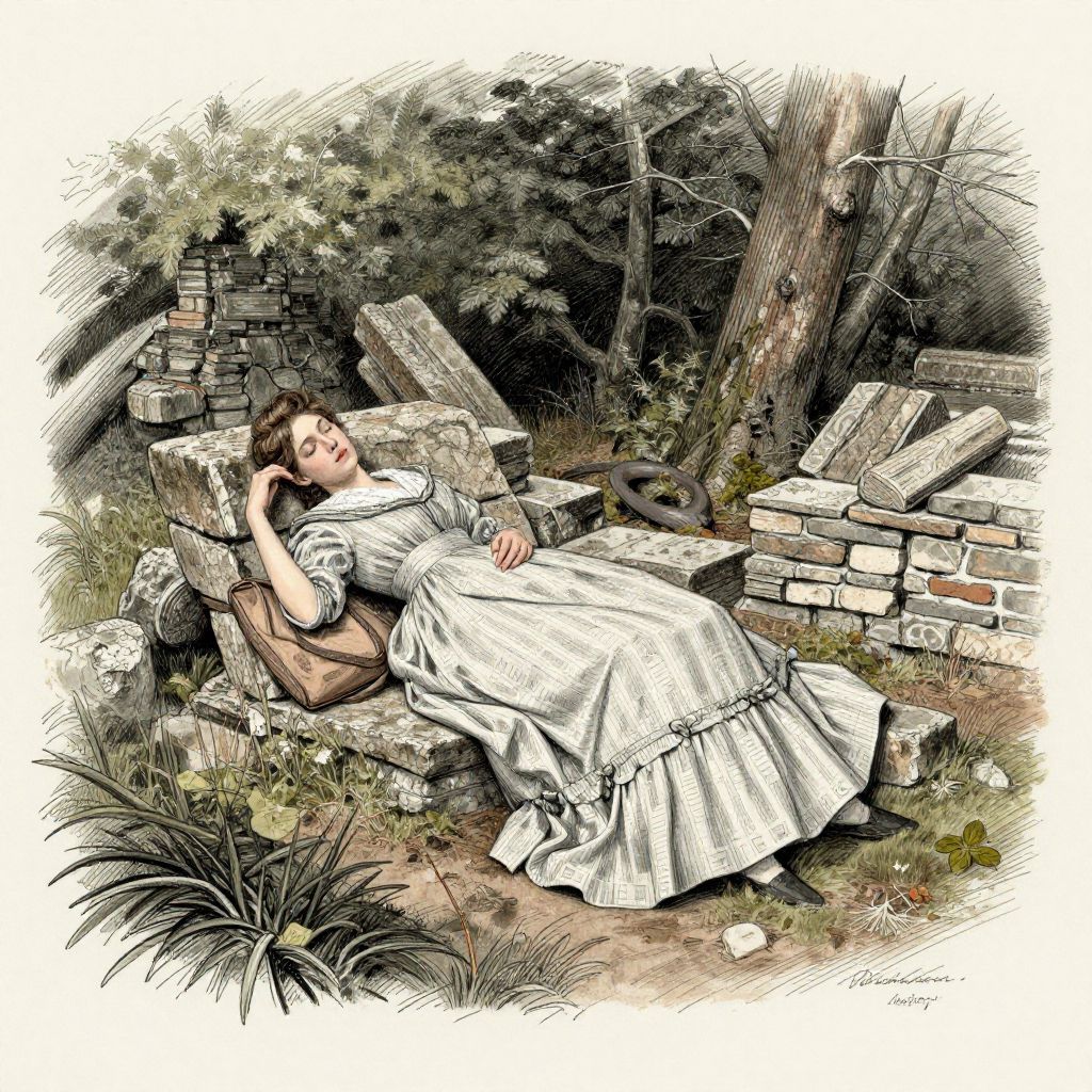 Leica Sl Edward Gorey drawing of a woman in an old-fashioned dress sleeping in some ancient ruins in the woods,
